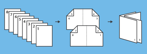 نیمهی بالایی صفحات اولیه رو تشکیل میدن. از صفحات نیمه بالایی شروع میکنیم و به ترتیب شماره، صفحات رو روی هم میچینیم. بعد از اتمام نیمهی بالایی نیمهی پایینی رو میچینیم. و در آخر با اطمینان از درست بودن ترتیب صفحات، کتاب رو مثل یه دفترچه از وسط منگنه میزنیم.