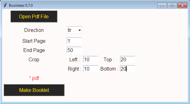 $ bookleter [ pdfname ] [ startPage-endPage ] [ direction: rtl, ltr ] [ page crop in pixels: 'left top right bottom' ]